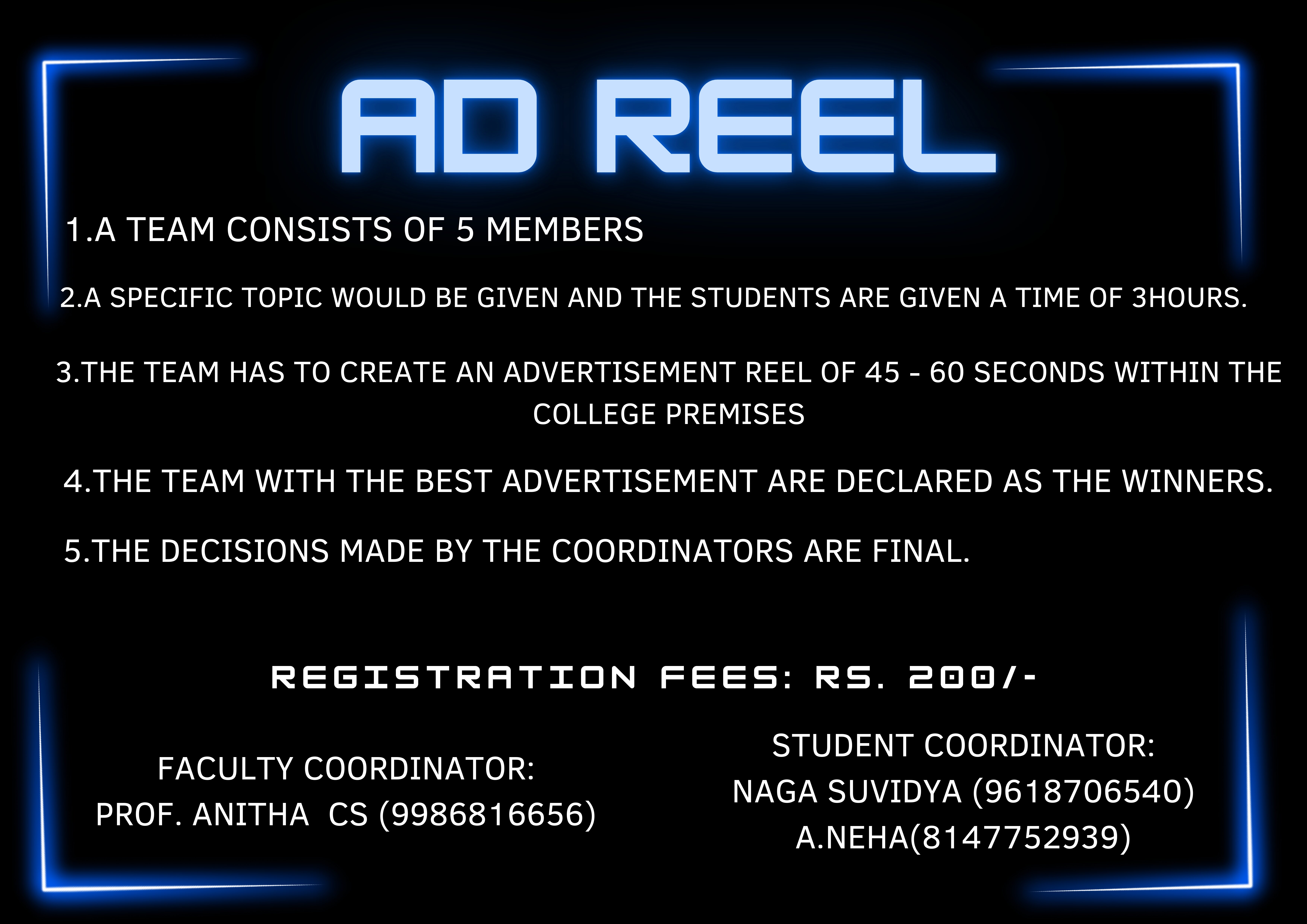 Team has to create an advertisement reel of 45 - 60 seconds within the college premises